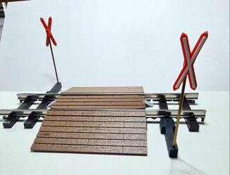 Der Bahnübergang für Gleistrecken ist mit einer Anpassrampe in Holzoptik und mit zwei Andreaskreuze ausgestattet.