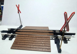 Der Bahnübergang für Zahnradstrecken ist mit einer Anpassrampe in Holzoptik und mit zwei Andreaskreuze ausgestattet.