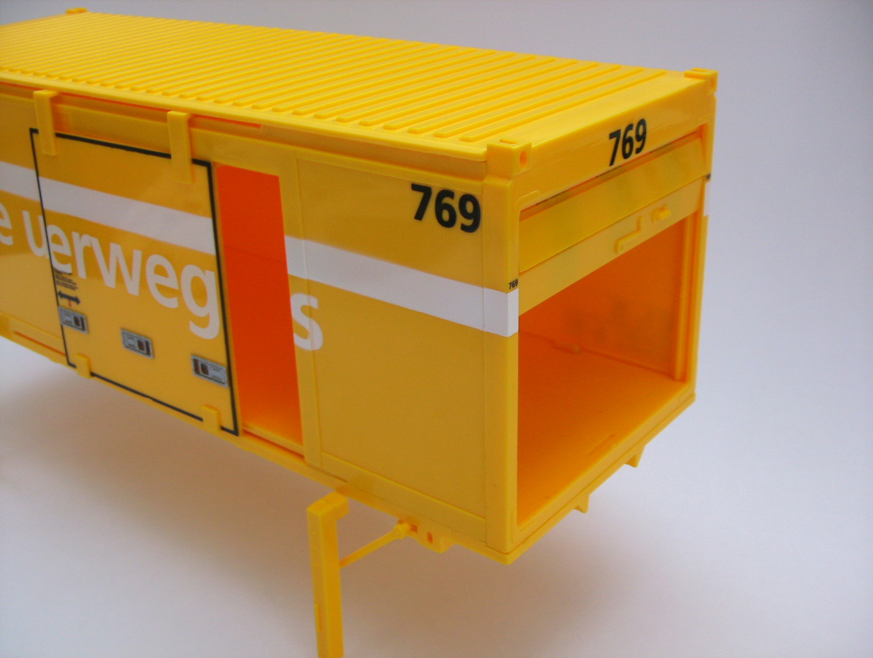 Der Container ist aus Kunststoff gefertigt. Die Türen und der Rollladen lassen sich öffnen und schliessen. Die Stützen sind funktionstauglich.