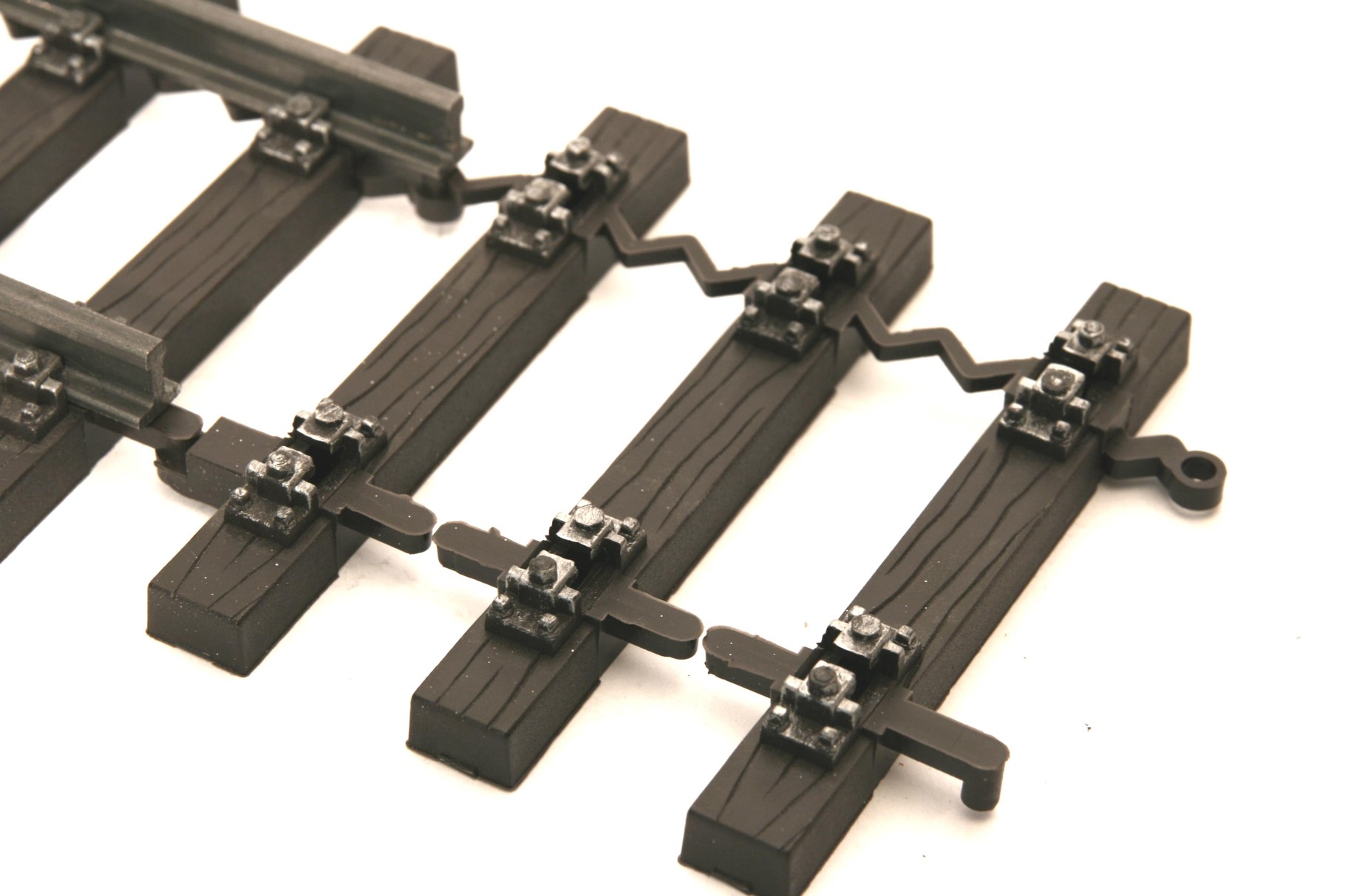 Die Schwellennägel können leicht nachcoloriert werden und ergeben ein echtes Bild von metallisch, leicht angerosteten Schienenbefestigungen.